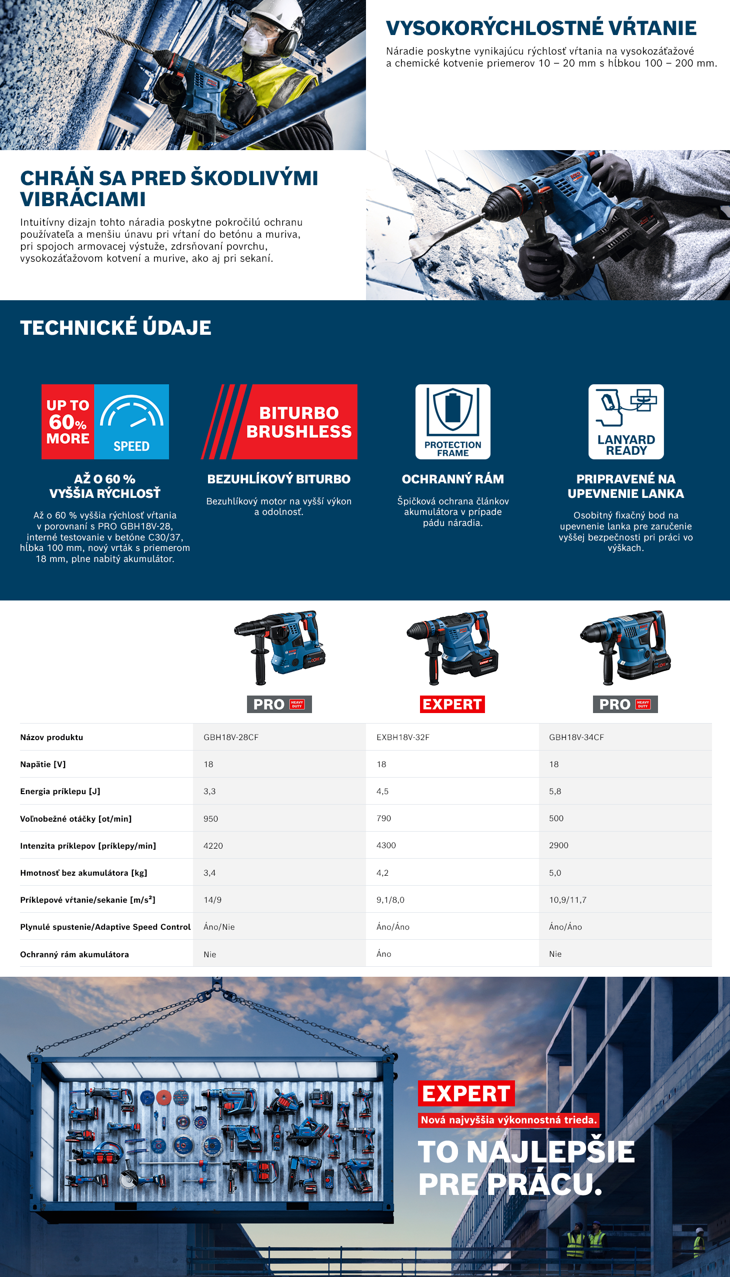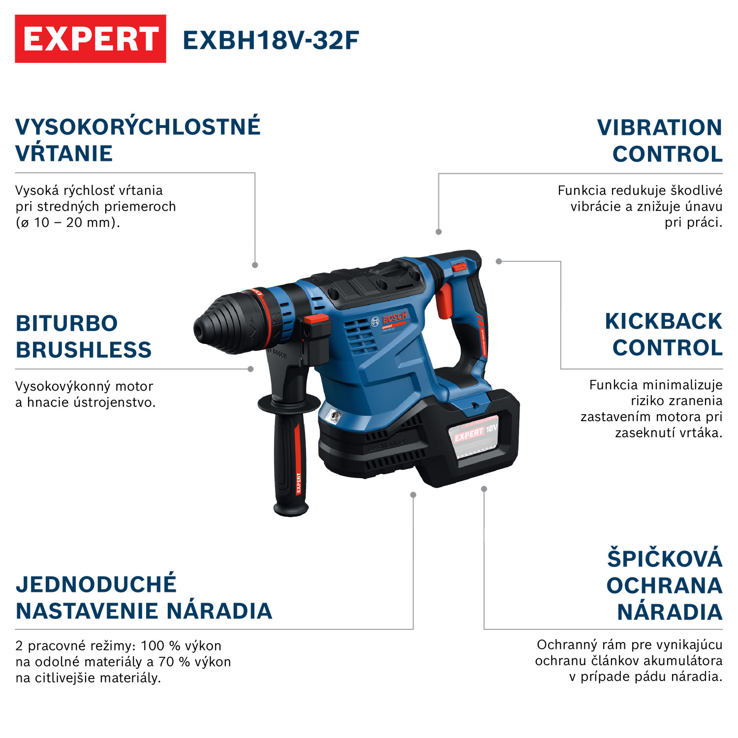 EXPERT EXBH18V-32F je robustní a vysokootáčkové vrtací kladivo SDS plus na vrtání velkých a hlubokých otvorů. Zvyšuje efektivitu práce díky až o 60 % vyšší rychlosti vrtání otvorů středních průměrů (⌀10 – 20 mm; v porovnání s Professional GBH 18V-28). Vše díky technologii BITURBO BRUSHLESS vysoce výkonným motorům a hnacím ústrojím, které jsou speciálně navrženy pro skvělé využívání extrémního výkonu akumulátorů EXPERT. Vysoce efektivní pohon zvyšuje produktivitu a umožňuje vytvořit výrazně více pevných ukotvení na jedno nabití akumulátoru. Vrtací kladivo SDS plus má zvýšenou ochranu: Funkce Vibration Control redukuje škodlivé vibrace a usnadňuje práci, funkce KickBack Control minimalizuje riziko zranění zastavením motoru při zaseknutí vrtáku. EXPERT EXBH18V-32F má také vynikající ochranu nářadí a extrémně odolný rám akumulátoru, který dokonale chrání články akumulátoru v případě pádu nářadí. Nářadí má jednoduchá nastavení a je vybaveno dvěma snadno použitelnými režimy: 100 % výkon na odolné a 70 % výkon na citlivější materiály.