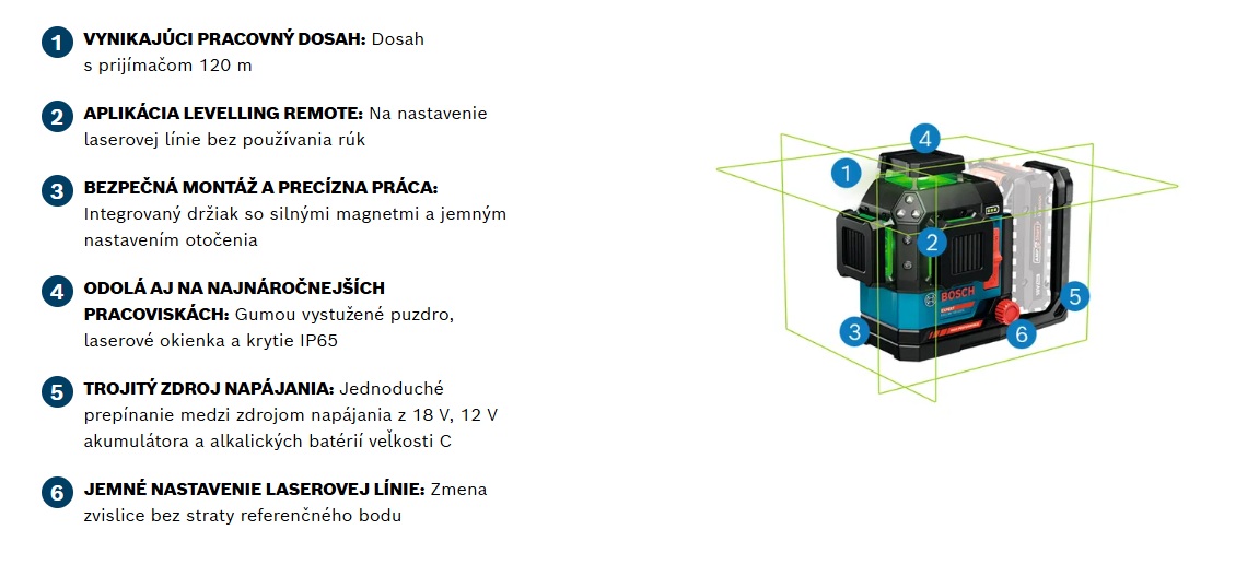 EXPERT EXLL18V-120-33CG poskytne profesionálům spolehlivou přesnost v nejnáročnějších pracovních podmínkách. Zajistí velký pracovní dosah až 120 m. Tři zdroje napájení umožní přepínat mezi napájením z 18 V/12 V akumulátoru a z alkalických baterií velikosti C, aby se předešlo prostojům. Tento liniový laser má pogumované pouzdro a zapuštěná laserová okénka s krytím IP65, čímž chrání přístroj před prachem, vodou či nárazy. Je vybaven podsvícenou rohovou klávesnicí na individuální výběr laserových linií a integrovaným držákem se silnými magnety na bezpečnou montáž. Jemné nastavení umožní změnit svislou linii bez ztráty referenčního bodu.