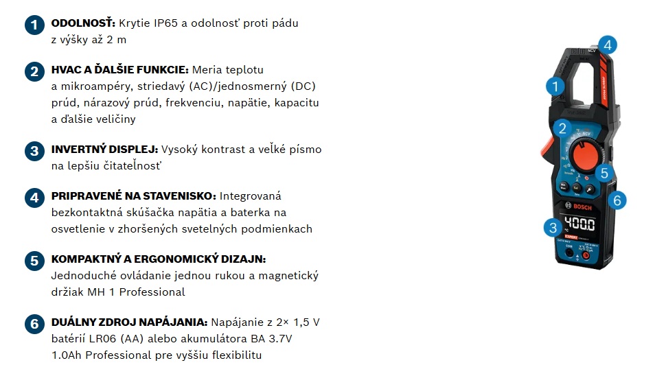 Klešťový ampérmetr EXPERT měří střídavý a jednosměrný proud až do 600 A a napětí do 600 V AC/DC. Kompatibilita s lithium-iontovým akumulátorem BA 3.7V 1.0Ah A Professional; magnetickým držákem MH 1 Professional, testovacími kabely MS 90 Professional a teplotní sondou typu K Professional.