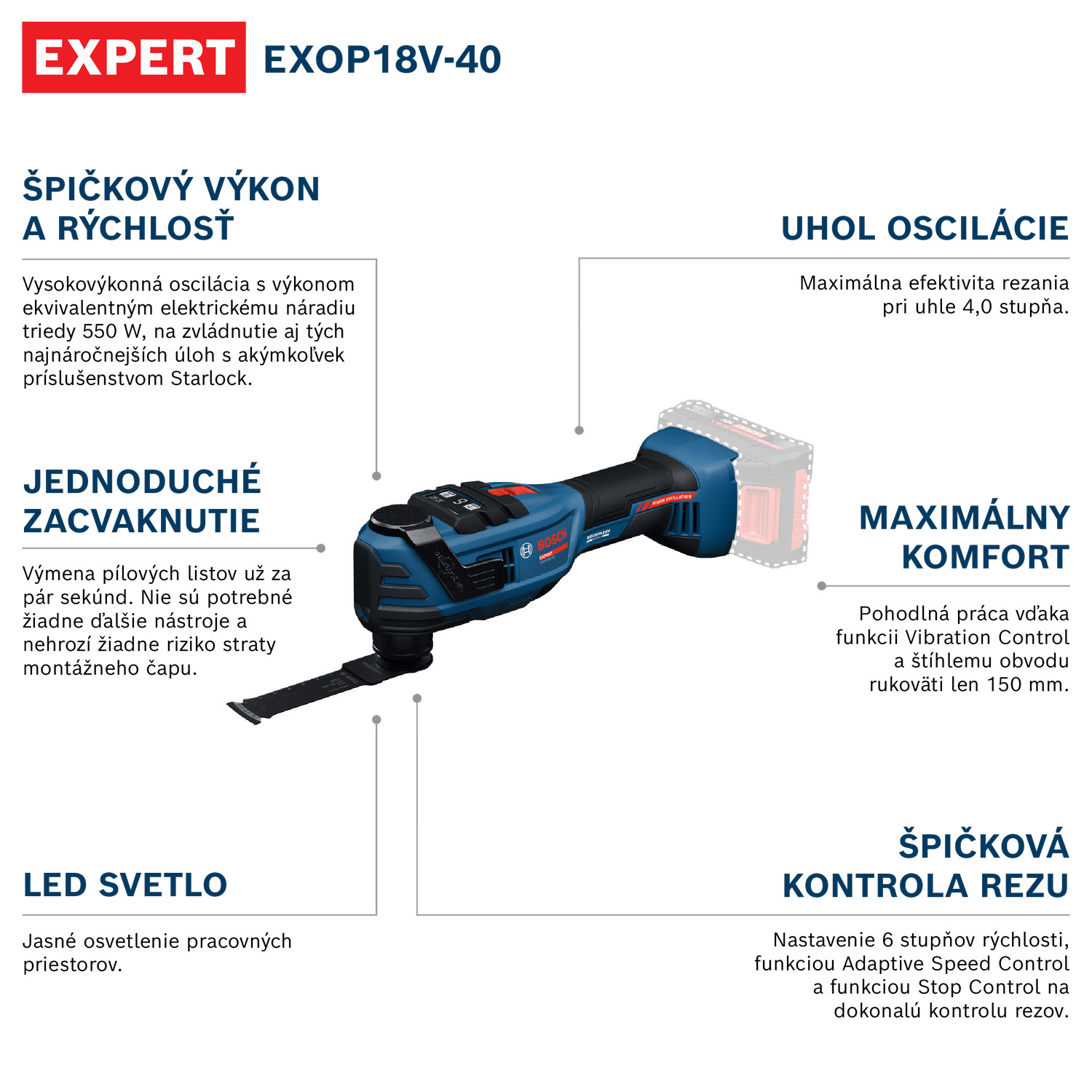EXPERT EXOP18V-40 je 18 V oscilační multifunkční nářadí s vynikajícím výkonem navržené na zvládnutí i těch nejnáročnějších prací s jakýmkoli kompatibilním příslušenstvím Starlock – včetně StarlockMax. Výkonný bezuhlíkový motor poskytne vysokovýkonnou oscilaci s výkonem ekvivalentním elektrickému nářadí třídy 550 W. Úhel oscilace je 4,0° pro maximální efektivitu řezání. Jednoduchý upevňovací mechanismus umožňuje rychlou beznástrojovou výměnu pilového listu a nehrozí riziko ztráty upevňovacího čepu. Funkce Vibration Control účinně snižuje škodlivé vibrace a štíhlá rukojeť s obvodem pouze 150 mm je navržena pro maximální pracovní komfort.