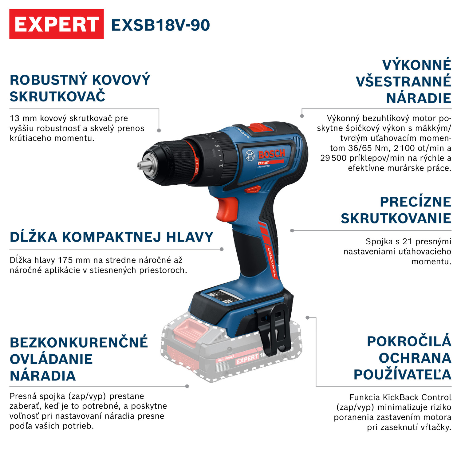 EXPERT EXSB18V-90 je špičkový příklepový vrtací šroubovák určený k vrtání do dřeva s maximálním průměrem 68 mm a do oceli nebo zdiva s průměrem až 13 mm. Kompatibilita se systémem Bosch Professional 18V a aliancí výrobců akumulátorů AMPShare.