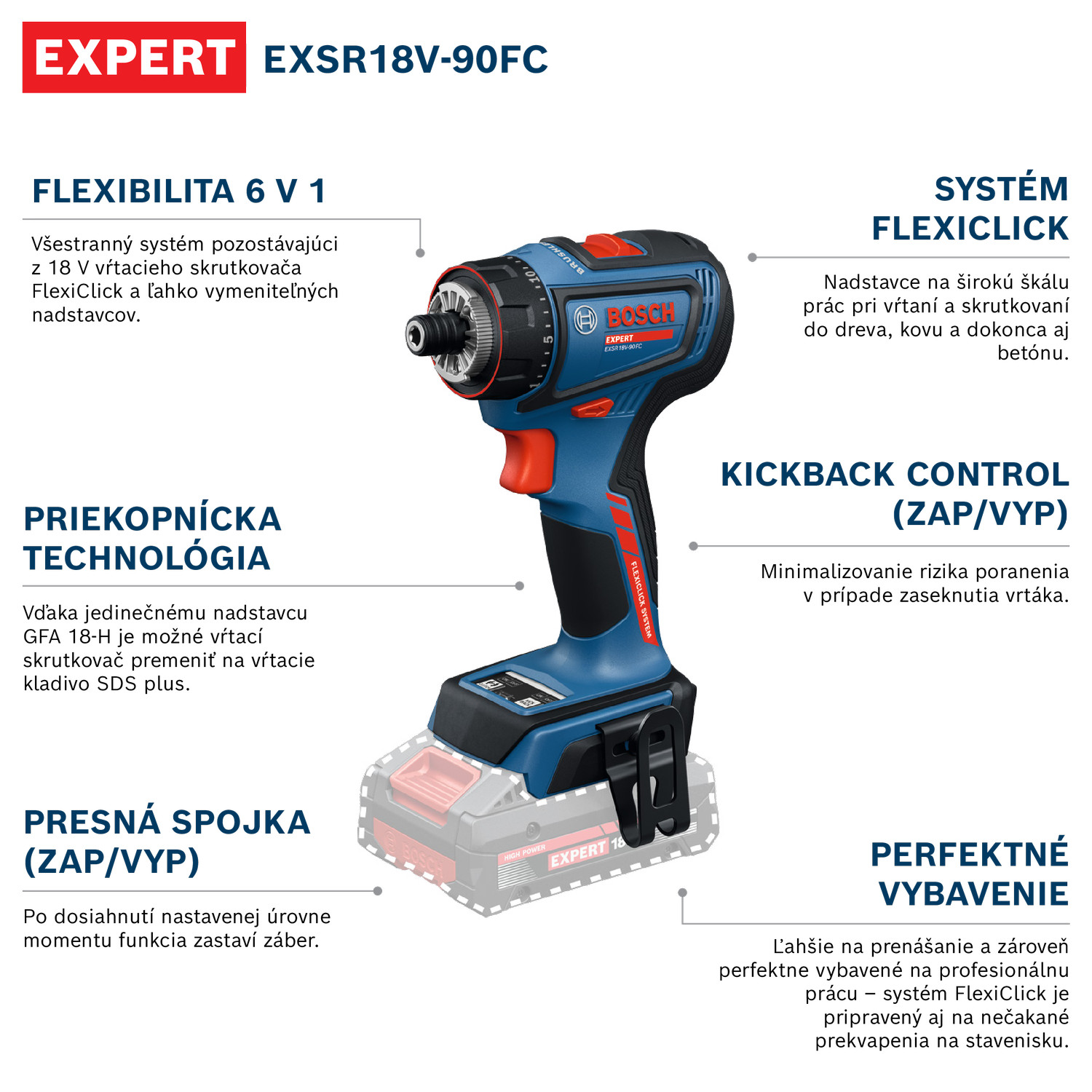 Výkonné nářadí EXPERT EXSR18V-90FC poskytne flexibilitu 6 v 1 díky snadno vyměnitelným nástavcům na vrtání a šroubování. Je součástí všestranného systému Bosch Professional FlexiClick, který je připraven na různé výzvy na staveništi. Jedinečný příklepový nástavec GFA 18-H promění nářadí na vrtací kladivo SDS plus, které bude připraveno na příklepové vrtání do betonu s Ø až do 10 mm. Nářadí má pokročilou ochranu: Funkce KickBack Control minimalizuje riziko zranění při zaseknutí vrtáku. Funkce přesné spojky po dosažení nastavené úrovně momentu zastaví záběr. Obě funkce je možné zapnout a vypnout. Systém FlexiClick redukuje hmotnost nářadí, které musíte nosit na staveniště. Nástavce FlexiClick dokáží na příležitostné použití nahradit specializované nářadí. FlexiClick System Bosch Professional – vynikající připravenost na profesionální práci.