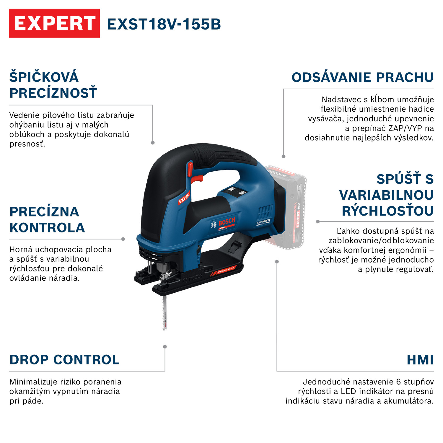 18 V přímočará pila EXPERT EXST18V-155B s válcovou rukojetí zajišťuje vynikající přesnost. Vodítko pilového listu zabraňuje ohýbání pilového listu i v malých obloucích a poskytuje dokonalou přesnost. Intuitivní ergonomický design s horní uchopovací plochou a spouští s variabilní rychlostí umožňuje dokonalé ovládání nářadí a zajišťuje vynikající přesnost řezu. Přímočará pila má pokročilou ochranu uživatele: Funkce Drop Control minimalizuje riziko zranění tím, že při pádu se nářadí okamžitě vypne. Zajišťuje spolehlivé odsávání prachu s snadno upevnitelnými adaptéry s kloubem na flexibilní umístění hadice vysavače a praktickým vypínačem ZAP/VYP pro nejlepší pracovní výsledky. Díky komfortní ergonomii je spoušť s variabilní rychlostí na zablokování a odblokování na dosah prstu a slouží také k pohodlnému a plynulému nastavení rychlosti. Uživatelské rozhraní HMI nářadí slouží k jednoduchému nastavení 6 stupňů rychlosti, LED indikátor poskytne přesnou indikaci stavu nářadí a akumulátoru.