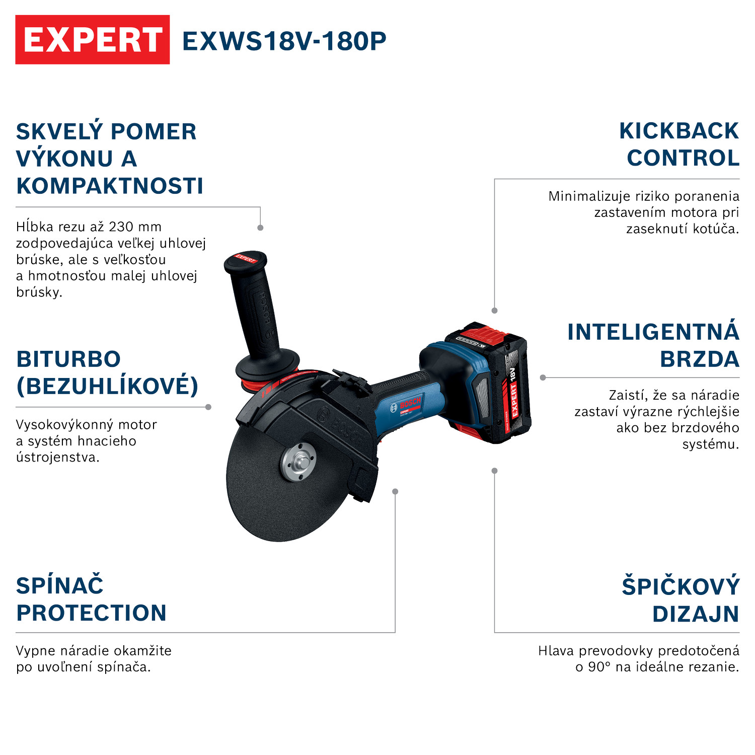 Špičková úhlová bruska EXPERT EXWS18V-180P poskytne dokonalý poměr kompaktnosti, hloubky řezu a ochrany. Nabízí extrémní hloubku řezu jako 230 mm velká úhlová bruska v kombinaci s kompaktními rozměry a hmotností malé úhlové brusky. Technologie BITURBO Brushless, vysoce výkonný motor a pohonný systém jsou dokonale navrženy pro skvělé využívání extrémního výkonu akumulátorů EXPERT. Úhlová bruska má pokročilou ochranu uživatele: spínač PROtection vypne nářadí ihned po uvolnění spínače. Funkce KickBack Control minimalizuje riziko zranění při zaseknutí kotouče a inteligentní brzda zajistí, že se nářadí zastaví podstatně rychleji než bez jakéhokoliv brzdového systému. Toto nářadí má vynikající konstrukci s předotočenou hlavou převodovky o 90 stupňů, díky čemuž je ideální na jakékoliv řezání.