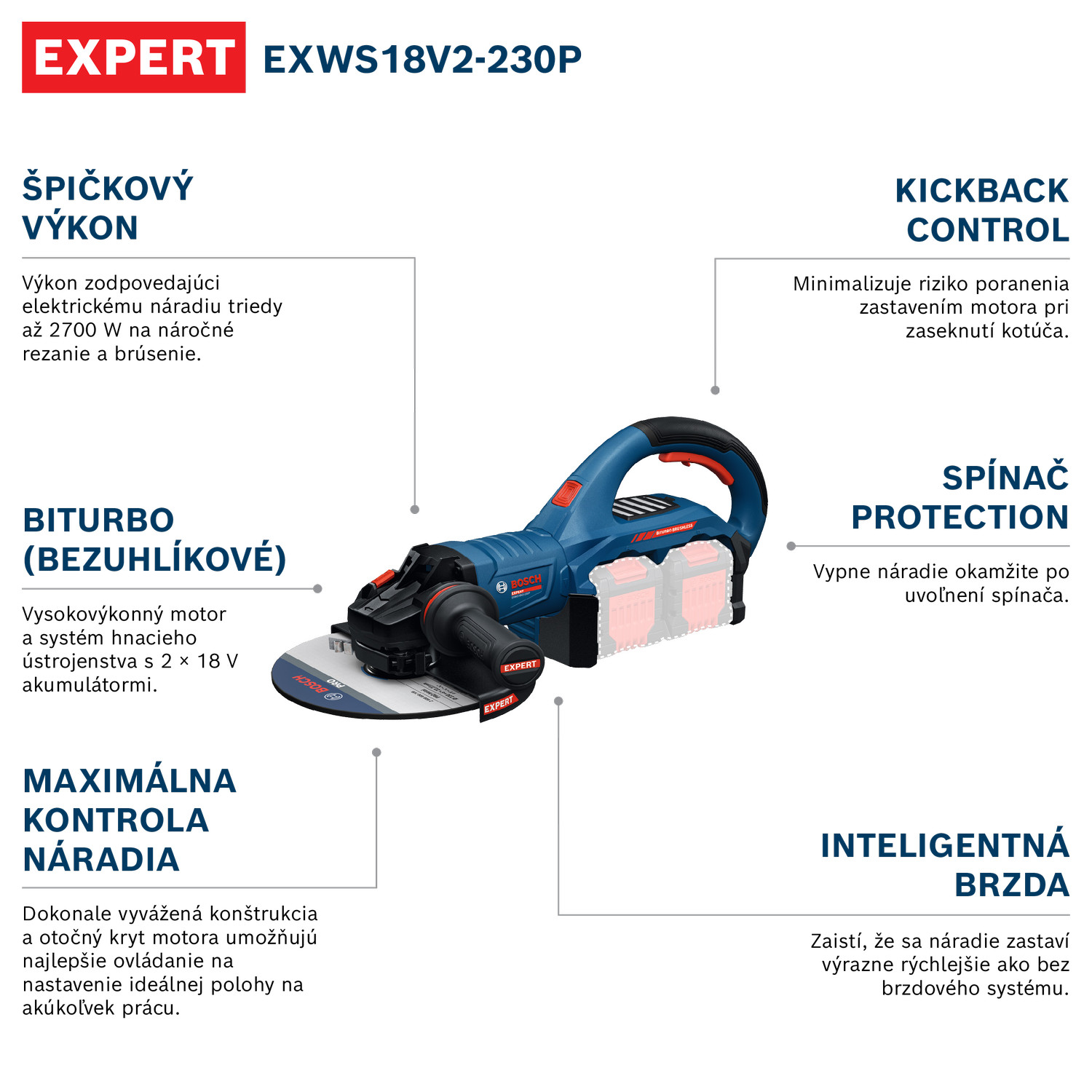 Velká úhlová bruska EXPERT EXWS18V2-230P s bezuhlíkovým motorem a 2× 18 V akumulátory poskytne výkon odpovídající elektrickému nářadí třídy až 2700 W pro rychlou a efektivní práci. Technologie BITURBO Brushless a 2× 18 V akumulátory, vysoce výkonný motor a pohonný systém jsou speciálně navrženy pro skvělé využití extrémního výkonu akumulátorů EXPERT. Otočný kryt motoru umožňuje nastavit ideální polohu pro jakoukoli činnost řezání či broušení. Dokonale vyvážená konstrukce a ideální těžiště navíc umožní vynikající ovládání nářadí v každé situaci. EXPERT EXWS18V2-230P má pokročilou ochranu uživatele: Funkce KickBack Control minimalizuje riziko zranění při zaseknutí kotouče. Spínač PROtection po uvolnění nářadí okamžitě vypne a funkce inteligentní brzdy zajistí, že se nářadí zastaví podstatně rychleji než bez brzdového systému.