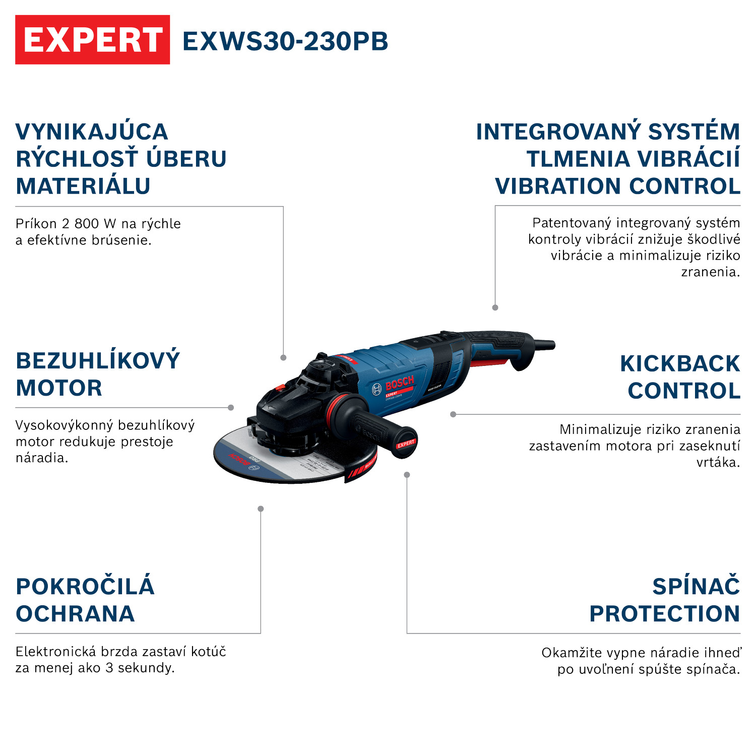 EXPERT EXWS30-230B poskytuje vysokou míru úběru materiálu díky 2800 W bezuhlíkovému motoru, který zároveň snižuje frekvenci potřeby údržby díky nižšímu počtu opotřebovaných dílů a nevyužívání uhlíků. Toto nářadí poskytuje všestrannou bezpečnost a praktičnost s elektronickou brzdou, která zastaví kotouč za méně než 3 sekundy, funkcí KickBack Control, ochranou proti opětovnému spuštění a plynulým spuštěním. Práce bude díky integrovanému systému Vibration Control, který minimalizuje vibrace, méně únavná.