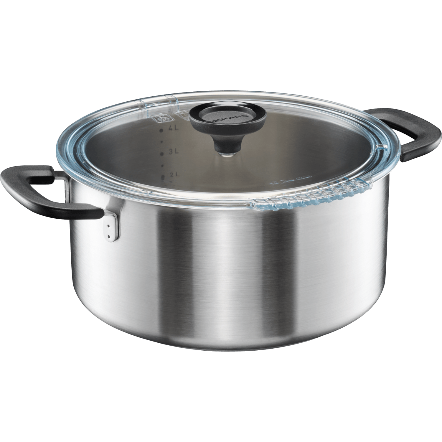 Velký 7litrový hrnec z nerezové oceli nabízí poklici z borosilikátového skla, které vyniká pevností a tepelnou odolností. Skleněná poklice navíc obsahuje praktické vestavěné sítko a ochranu proti přetečení. Z 90 % je tělo hrnce tvořeno recyklovanou nerezovou ocelí, přičemž uvnitř nechybí odměrná stupnice objemu. Tento hrnec je bezpečné mýt v myčce na nádobí. Výroba je lokalizována ve Finsku v továrně Fiskars v Sorsakoski.
