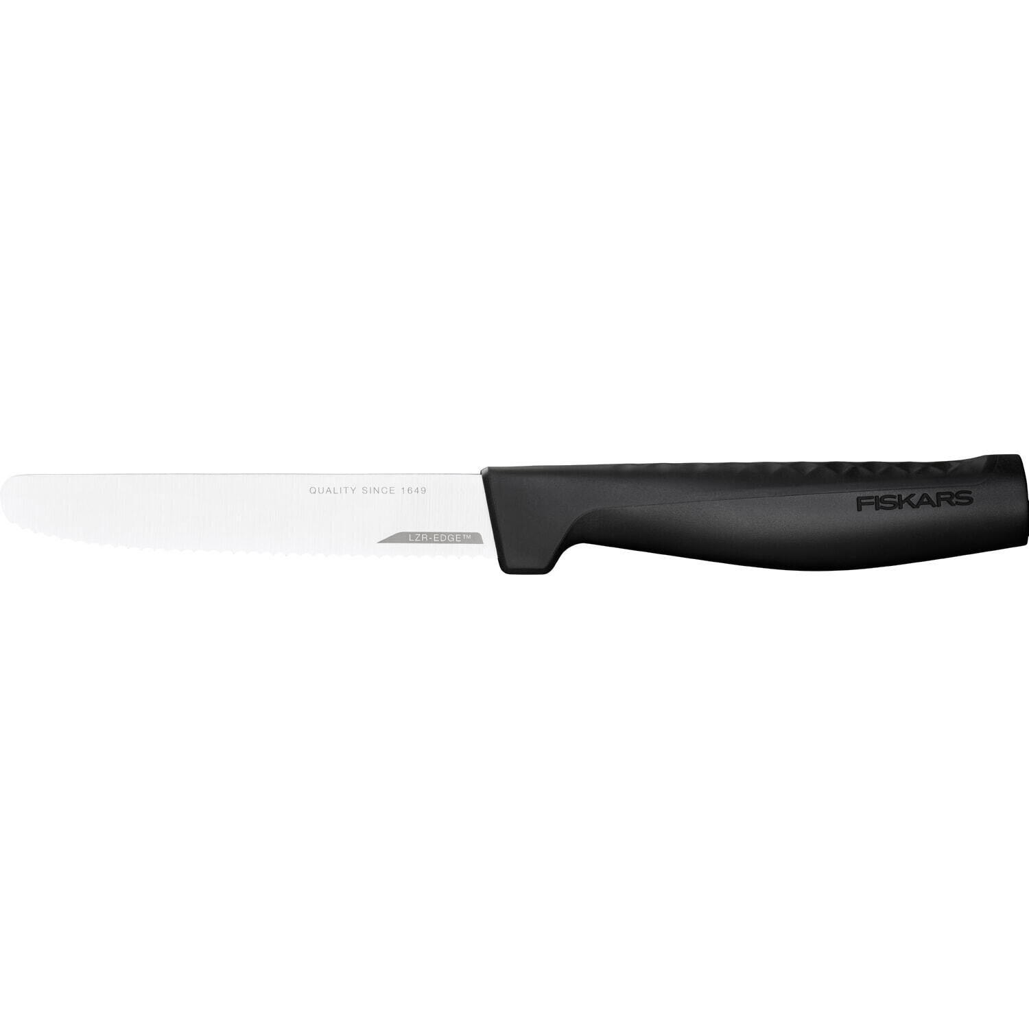 Snídaňový nůž se zubatou čepelí je ideální volbou pro krájení ovoce a zeleniny s tenkou slupkou. Nerezová ocel zajišťuje pevnost čepele. Technologie ostří LZR-EDGE™ zaručuje, že nůž vydrží ostrý 4x déle než jiné běžné nože. Ergonomická rukojeť s 3D vzorem je navržena tak, aby zajišťovala perfektní úchop.